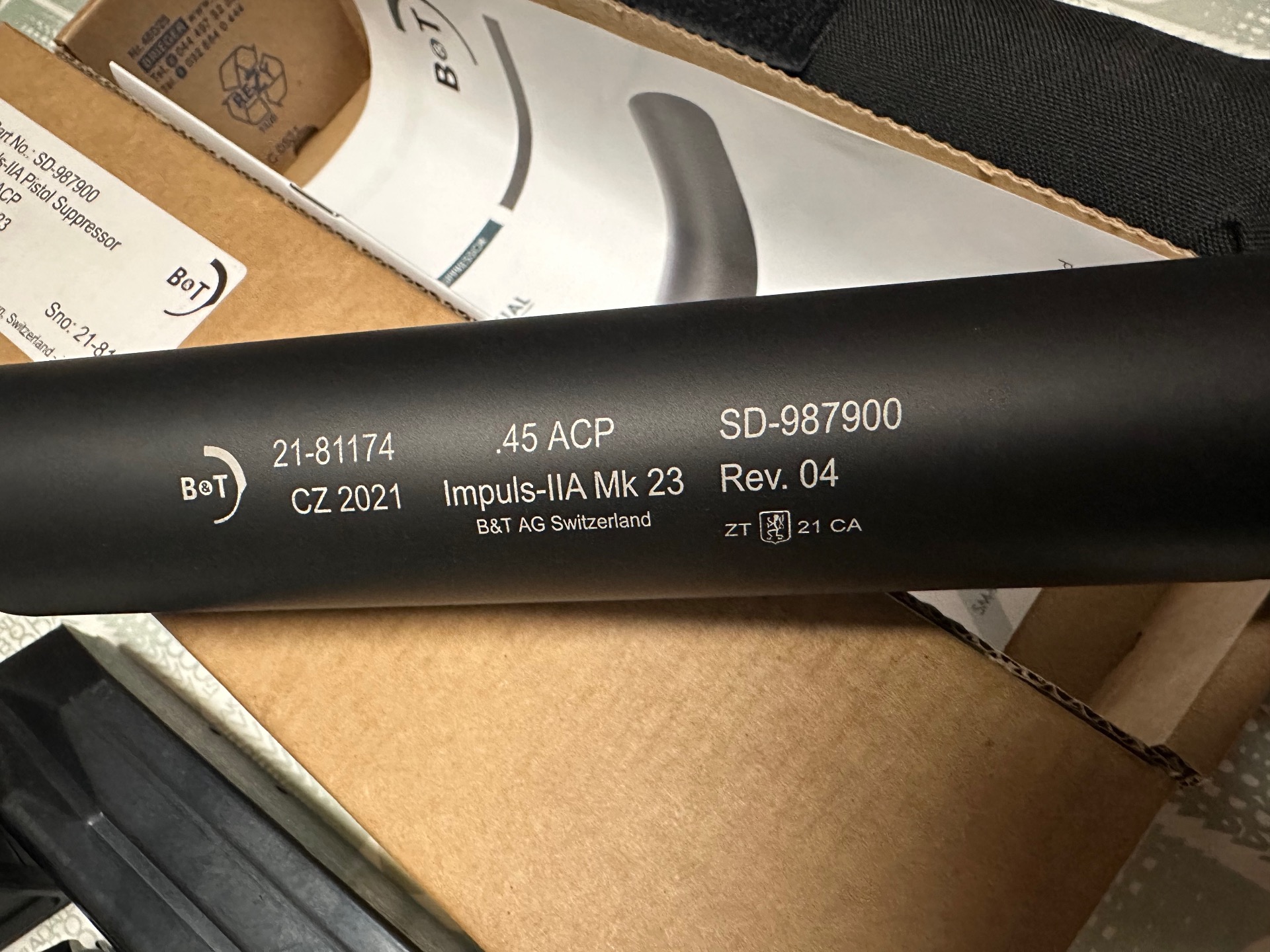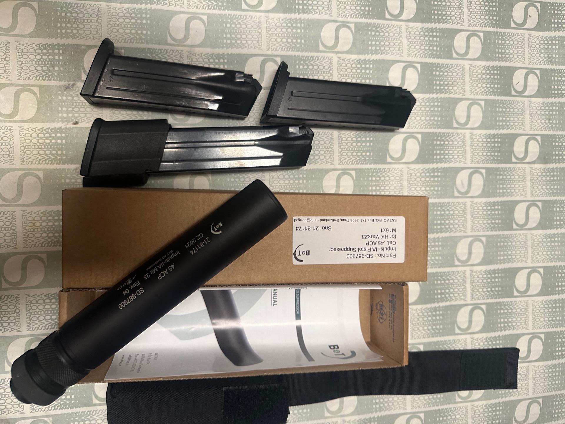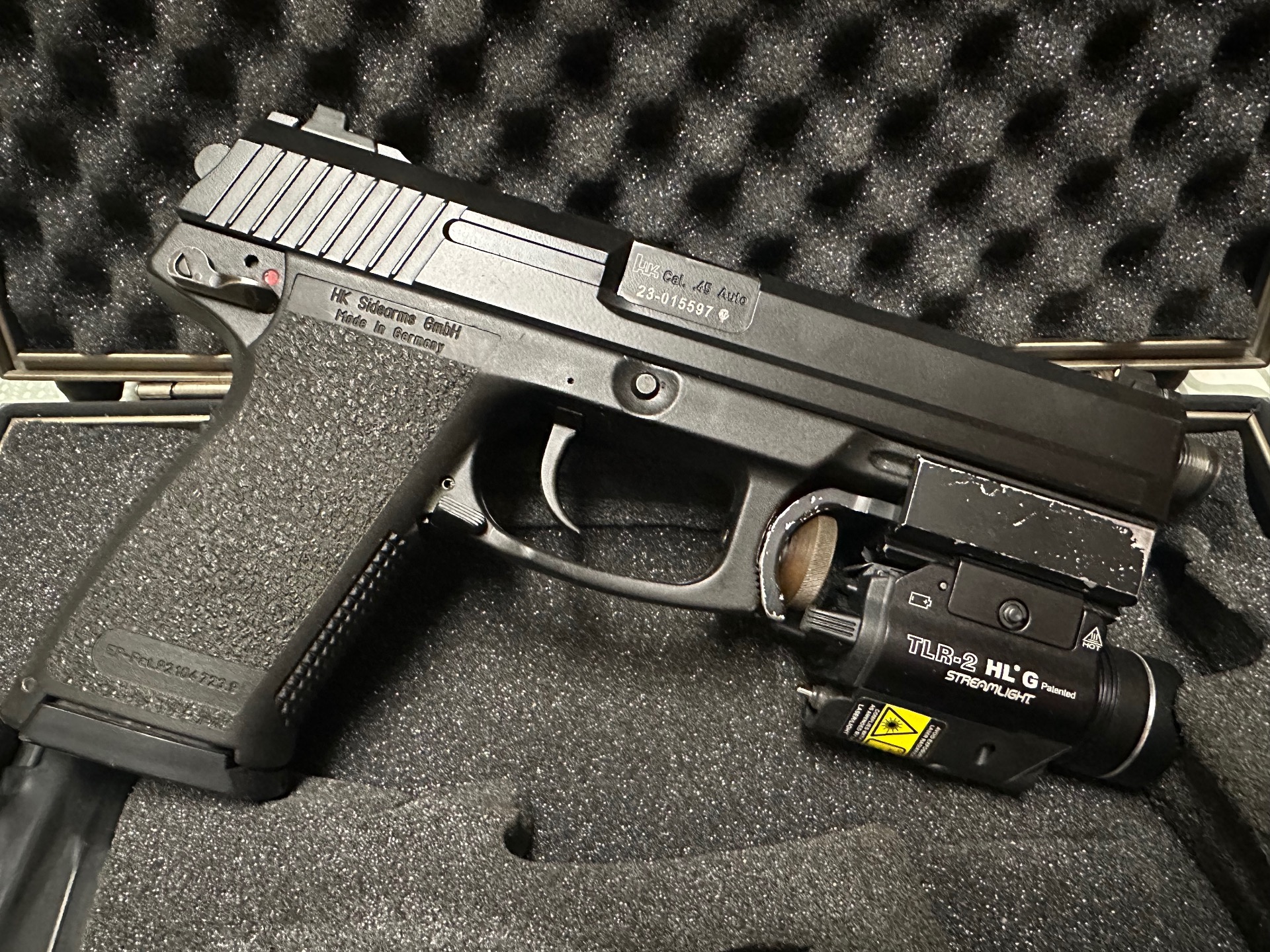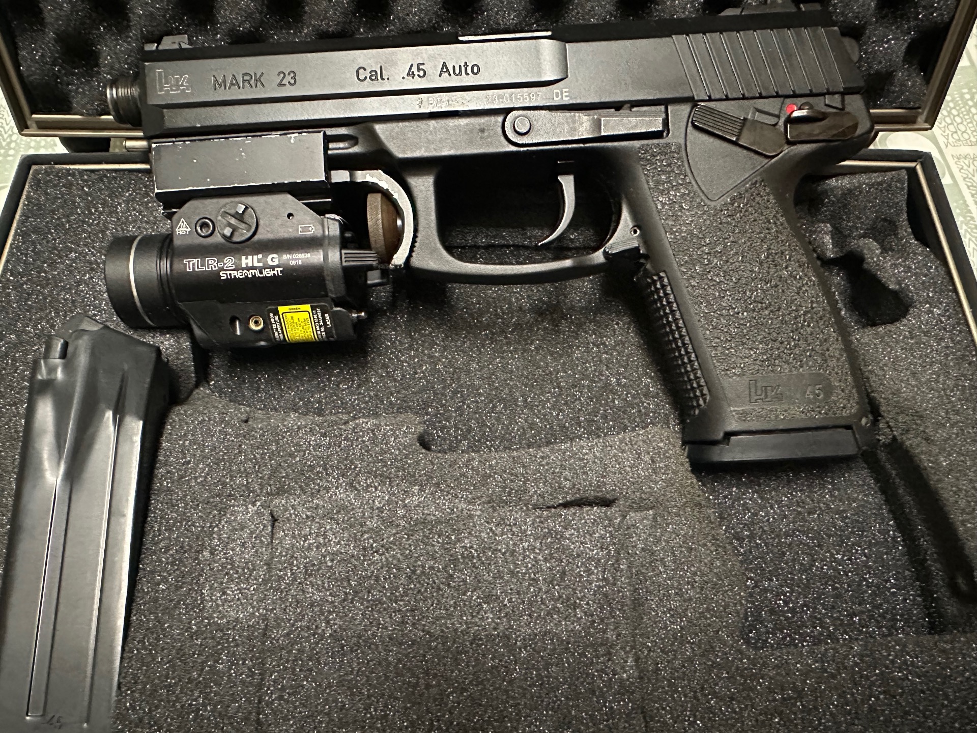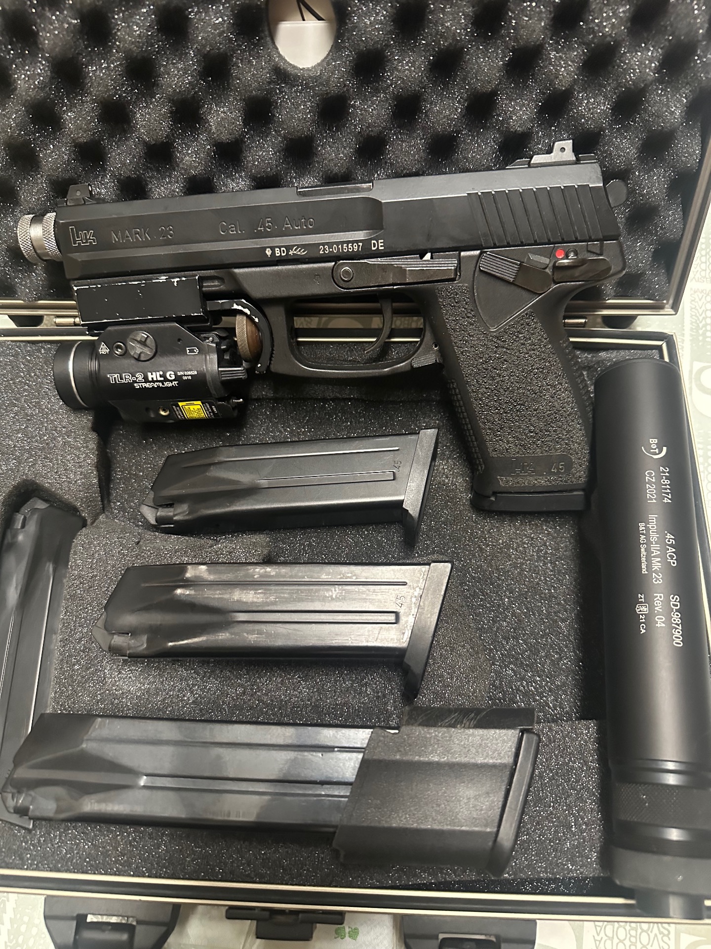 Heckler & Koch MARK 23 + nesehnatelný originální tlumič B&T Impuls II vyladěný pro MK23 + zelený laser a stroboskopická baterka TLR-2 na speciální montáži pouze pro H&K + zásobníky + pouzdro